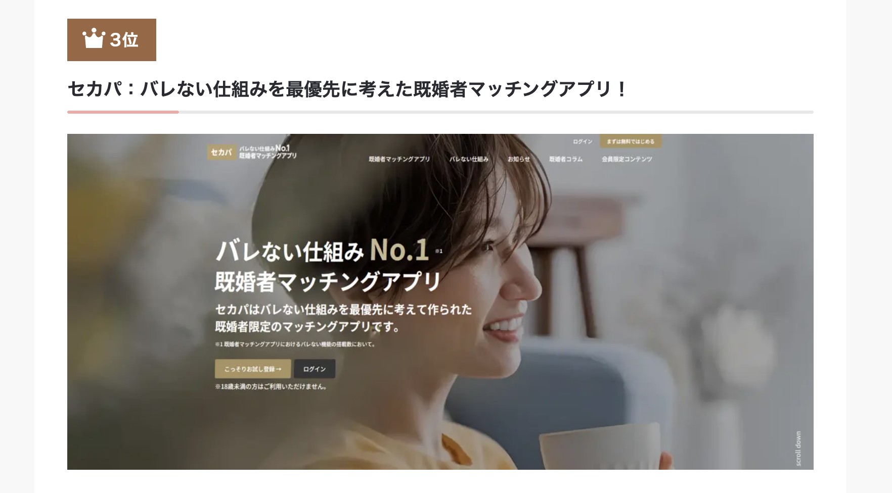 既婚者向けマッチングサービス「セカパ」は、マッチングアプリ・婚活アプリおすすめ比較メディア「ユアマッチ」にて公開された記事において、おすすめ第3位に選出されました。